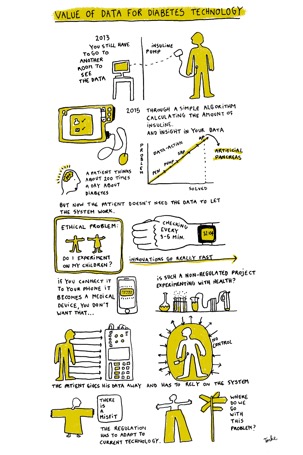 The artificial pancreas, a closed loop system that continuously monitors health data and injects insulin when needed, was one of the technologies that was discussed. Stakeholders related to diabetes (including patients) regarded it as a promising technology that can take away a large burden of the disease, but the technology is still in its development. Interestingly, some of the participants posed concerns that the closed loop system might take away too much control of patients, and argued that users should have insights in their health data and get the possibility to take back the control of regulating their insulin levels when they prefer to. It was also discussed who else (e.g., caregiver, company that develops the devices) should have access to the health data. One of the members of the ‘we are not waiting’ community, who was also present at the workshop, emphasized that an open source platform where patients voluntarily share their data could help to improve the algorithms that regulate the glucose levels.