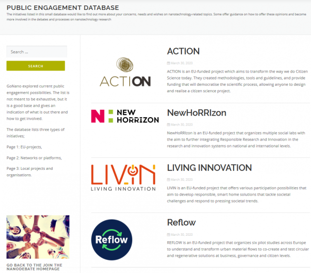The findings from this report have been used as input for the online resource database and the ‘How to.. ‘ guide for citizens and other stakeholders who would like to engage with nanotechnologies.